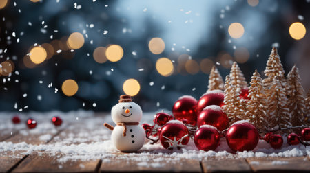 AI Generated. Festive red ornaments surrounded by snow and winter lights at dusk