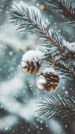 Festive pine cones and red baubles nestled in snow-covered branches, illuminated by warm, golden Christmas lights.