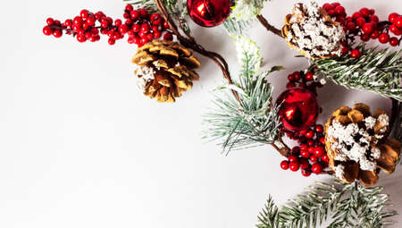 Winter holidays postcard - Holiday background with christmas decor and snow. Composition of pine cone, red berries, green leaves. New Year greeting card. Empty space for text, copy space.