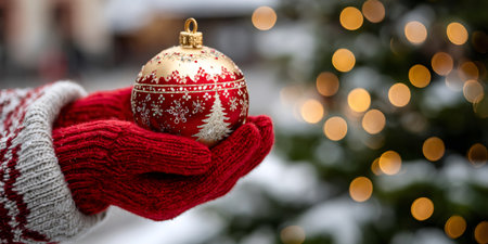 Hands in red mittens holding a festive Christmas ornament with bokeh lights