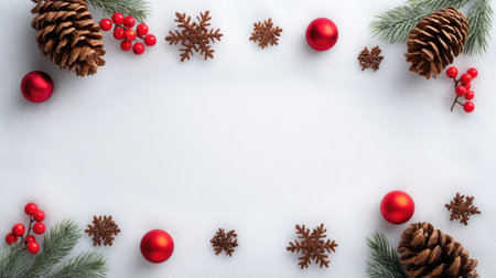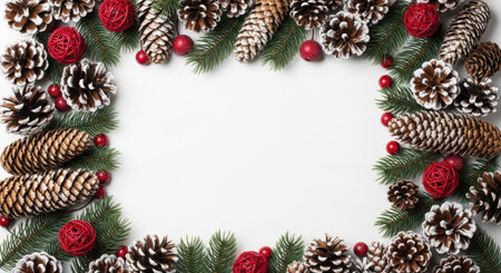Festive Red Frame Surrounded by Holiday Decorations, Pine Branches, Berries, Ornaments, and Natural Elements on a White Background