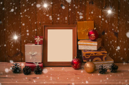 Christmas decorations Picture frame on wooden floor and have copy space for design in your work.