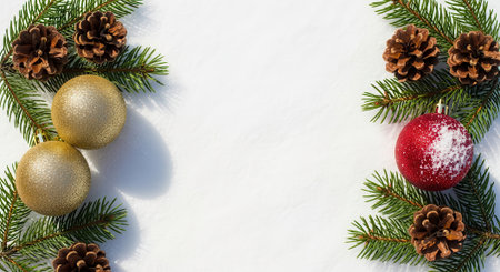 A crisp holiday border with fresh pine branches and bright metallic baubles placed symmetrically on both sides.
