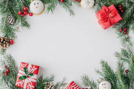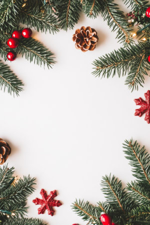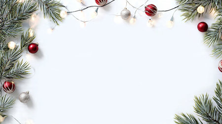 Christmas light background, fir branches wreath with red baubles and berries, beautiful frame and copy space for your text. White creative layout, flat lay, top view.