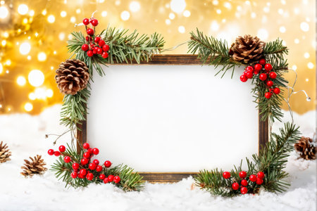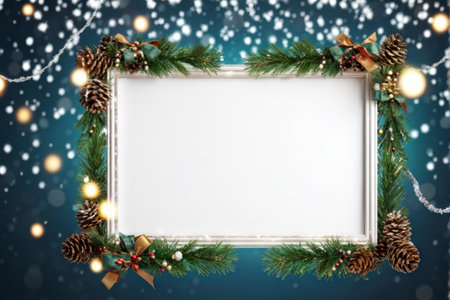 A decorative Christmas border with pine cones, holly berries, red bows, lights, and snowflakes adorns an empty white frame against a dark blue background sprinkled with golden bubb