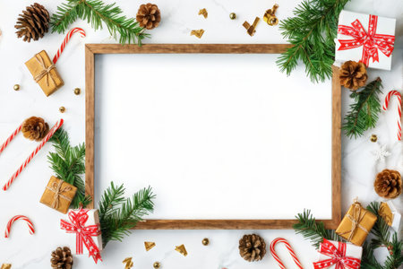 The a Christmas-themed frame adorned with red berries, pine decorations, and white pearl ornaments placed on a marble surface. Beside the frame, there are two wrapped gifts with red ribbons and snowflake patterns. The marble surface has a smooth texture with light and shadow reflections, enhancing the festive and mood of the scene.