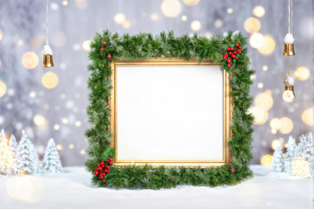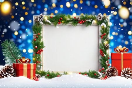 This festive winter scene features a blank frame surrounded by blue ornaments and fresh greenery, creating a perfect backdrop for holiday projects and events.