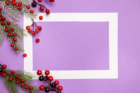 Christmas holidays composition with christmas decorations, red berries branches and white frame on purple background with copy space, top view