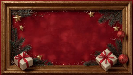 A festive Christmas-themed decoration features evergreens, pine cones, red berries, holly leaves, lights, baubles, and bows against a dark backdrop with golden frames in the center