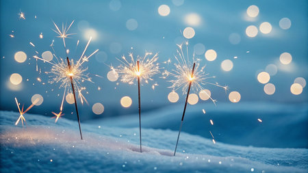 Winter Magic Sparkling Sparklers in Snowy Landscape with Colorful Bokeh Lights, Ai Generated
