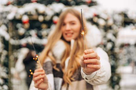Woman holding sparkler night while celebrating Christmas outside. Dressed in a fur coat and a red headband. Blurred christmas decorations in the background. Selective focus