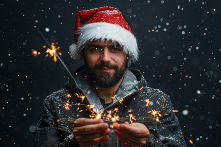 Joyful young man with sparklers in santa hat