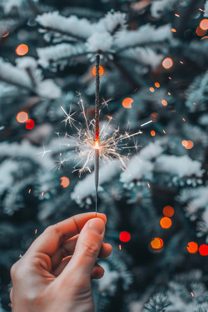 A hand in a cozy sweater holds a sparkler, illuminating the scene with bright sparks. Soft lights from a nearby tree create a warm and festive atmosphere in winter.