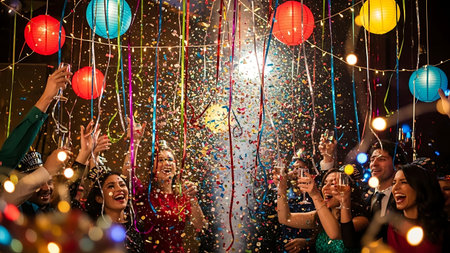 A group of people joyfully celebrating as confetti fills the air, Joyful celebrations with friends and family