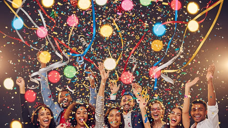 A vibrant explosion of colorful confetti rains down on a group of smiling people with their hands raised in celebration, creating a lively and joyful atmosphere.