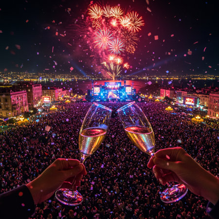 Aerial view of fireworks and people celebrating new year with champagne glasses