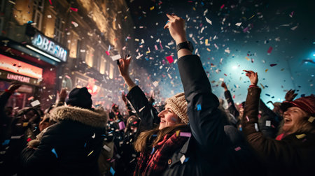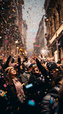 colorful confetti raining down on a happy crowd of people, created with generative ai