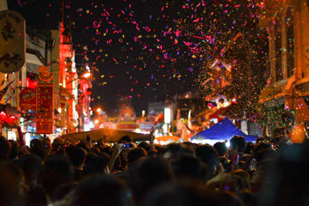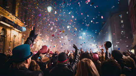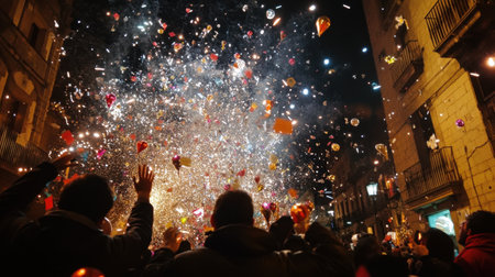 A vibrant crowd gathers in a city street at night celebrating with confetti and fireworks lighting up the sky creating a joyful atmosphere.