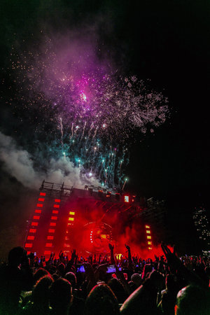 Unfocused image of a joyful crowd with raised hands enjoying a night celebration with colorful fireworks and confetti.