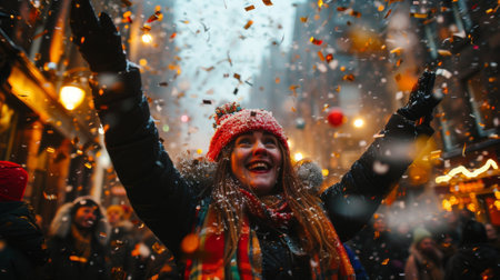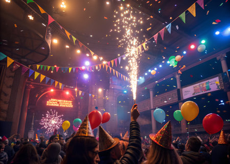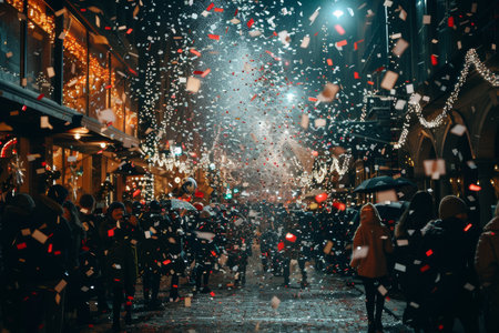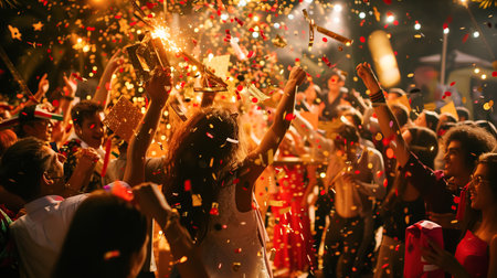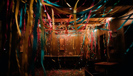 Vibrant colors illuminate the night, confetti and streamers fly generated by artificial intelligence