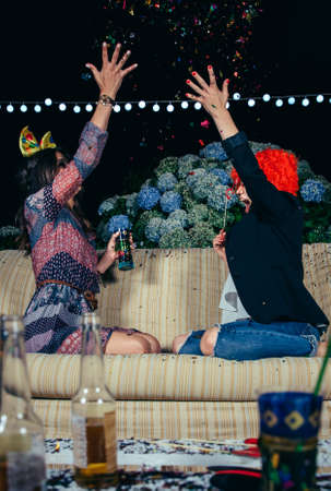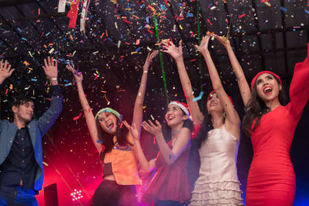 confetti party happy young people group celebrating new year eve while dancing and have fun at home