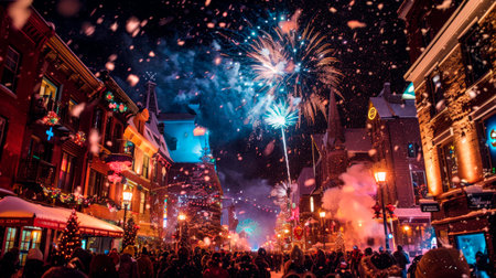 A vibrant winter celebration captures a bustling street adorned with holiday lights. Fireworks burst overhead, bringing joy to the crowds gathered below in the snow.