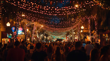 A street celebration with overhead lights casting a warm glow on the crowd.