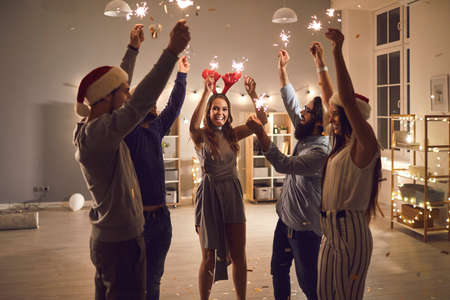 Group of smiling young friends or coworkers holding burning sparklers and wishing each other Merry Christmas and Happy New Year at cozy party at home or in company office decorated with lights.