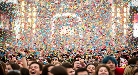 An energetic and vibrant scene of a massive crowd of people at a music festival or celebration, completely immersed in a shower of colorful confetti. The joyful faces of the audience look up as the air is filled with fluttering paper, capturing a moment of pure euphoria and shared excitement. This image represents celebration, happiness, and large public events.