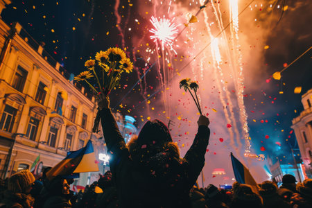 Crowd celebrating peace in Ukraine with flags, flowers, fireworks, and joy, Kiev