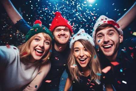 Diverse group of friends joyfully celebrating with confetti, showcasing their happiness and connection in a lively atmosphere filled with excitement and energy