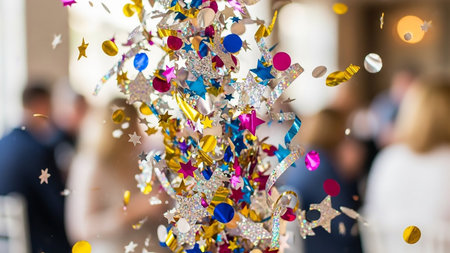 A vibrant explosion of colorful metallic confetti and streamers in star and circle shapes fills the frame, with blurred figures of people in the background.