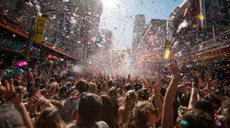 colorful confetti being thrown into the air by crowd of people, created with generative ai