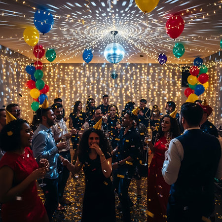 moment as colorful confetti rains down from the ceiling at our unforgettable New Year's Eve celebration. Our stunning action shots perfectly encapsulate the joy and festivity of the night