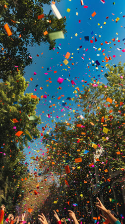 High school students gleefully tossing vibrant confetti in the air, marking their graduation with laughter and jubilation