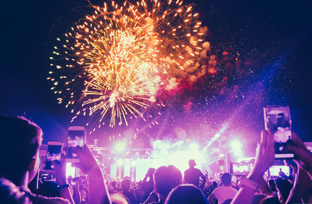 Concert in the night with firework silhouettes of fanclub show hand action.