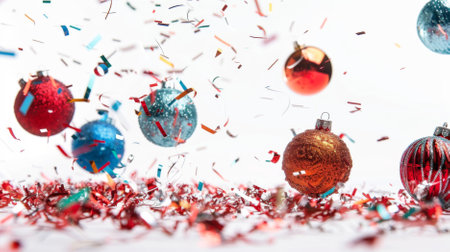 Christmas ornaments hanging on a decorated tree with snowfall, background, AI Generated