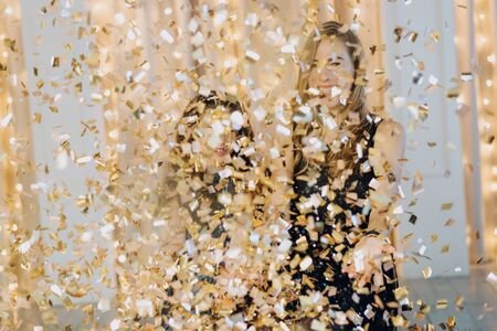 Graduation evening with flying golden confetti, a solemn ceremony for the end of the academic year and university. Festive background
