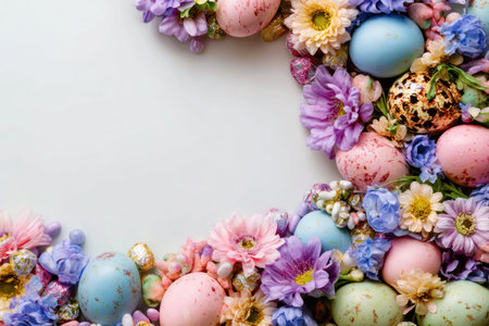 Pastel-colored Easter eggs and floral arrangement border a white background