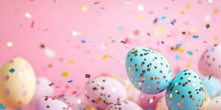 Colorful balloons and confetti create a festive atmosphere on a vibrant pink backdrop for Easter celebrations ,.,
