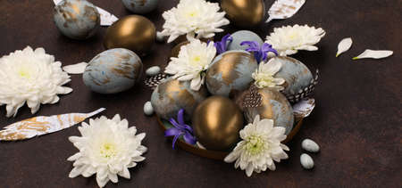 Festive Easter holiday greeting card. Easter Decoration with gray blue golden eggs, quail feathers, white flowers on dark wooden background. Happy Easter card concept. Selective focus, copy space.