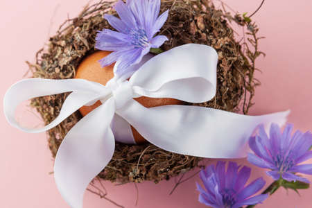 Easter concept, egg in a nest with a white ribbon. Happy Easter
