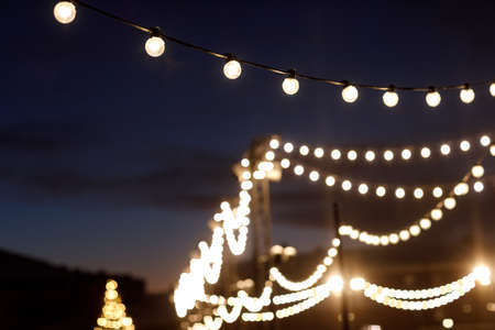 Christmas lights on the background of the evening sky. Christmas decorations.