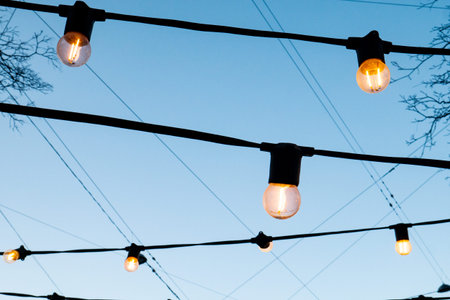Light bulbs against the evening blue sky. Lanterns glowing with a pleasant warm yellow light.