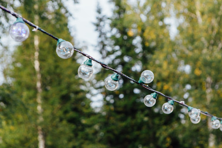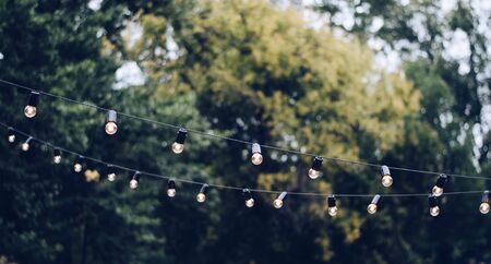 Lanterns-light bulbs on a background of green trees. Hanging lights at the festival. Street decor. Design background