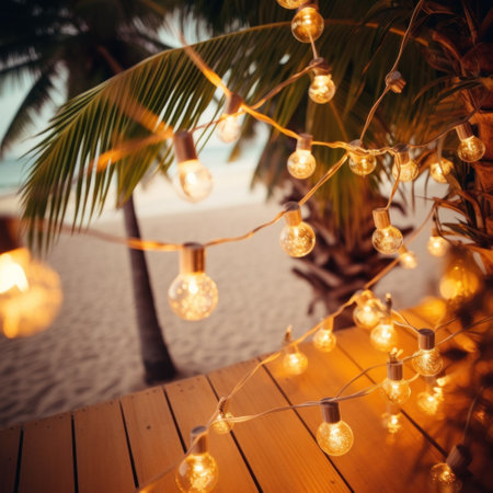 Sunset background of coconut palm trees with bokeh styled yellow string lights in an outdoor restaurant. Generative AI