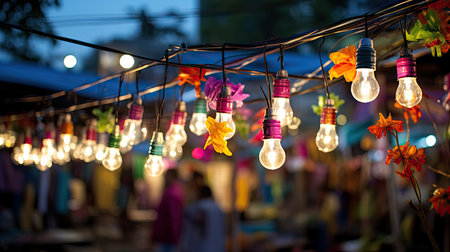 Festival garland light bulbs hanging over outdoor shopping area copy space