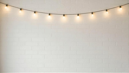 A charming arrangement of string lights illuminated above a clean, white brick wall.