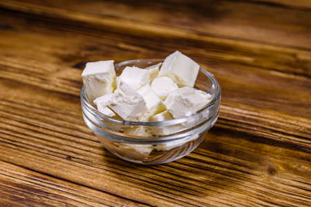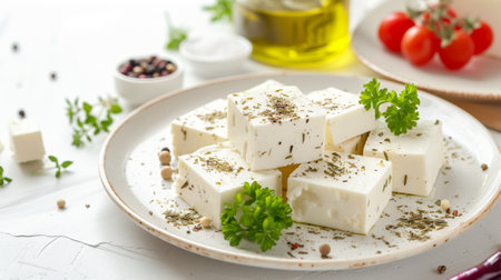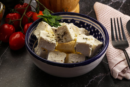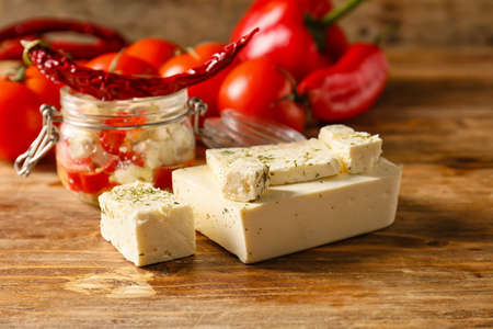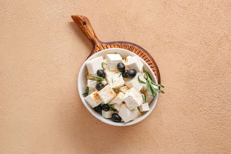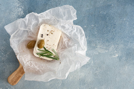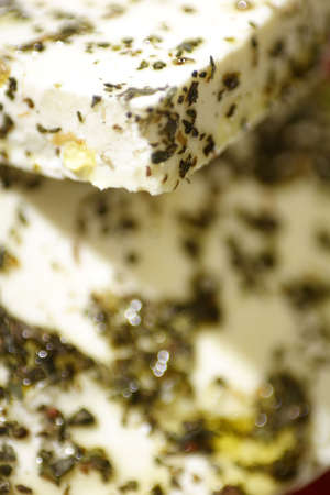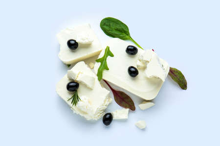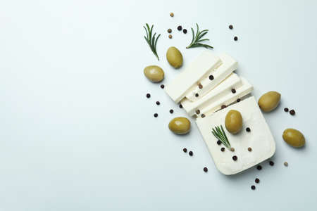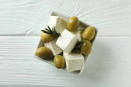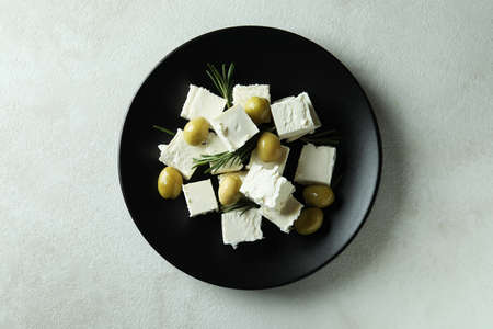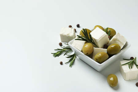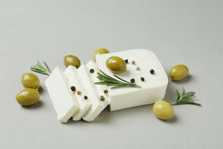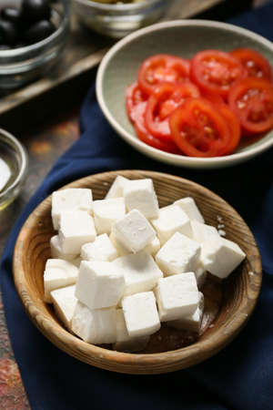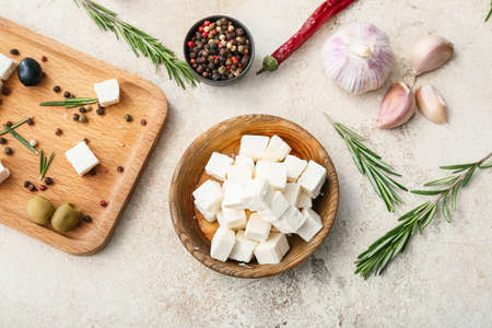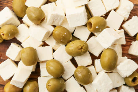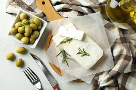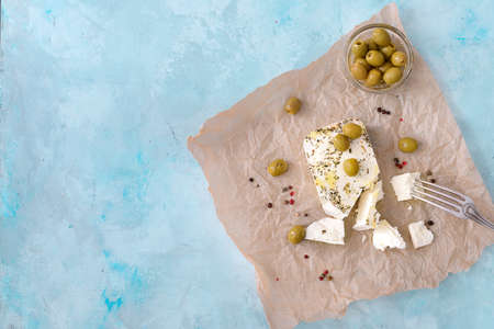 Greek cheese feta with rosemary and olives. Healthy ingredient for cooking salad. Chopped Goat feta cheese