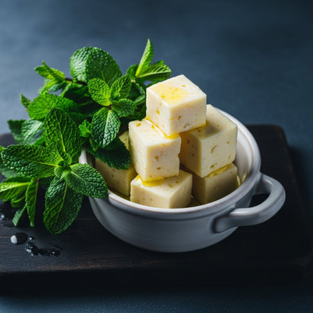 Cubes of fresh homemade butter with mint and sea salt on dark background